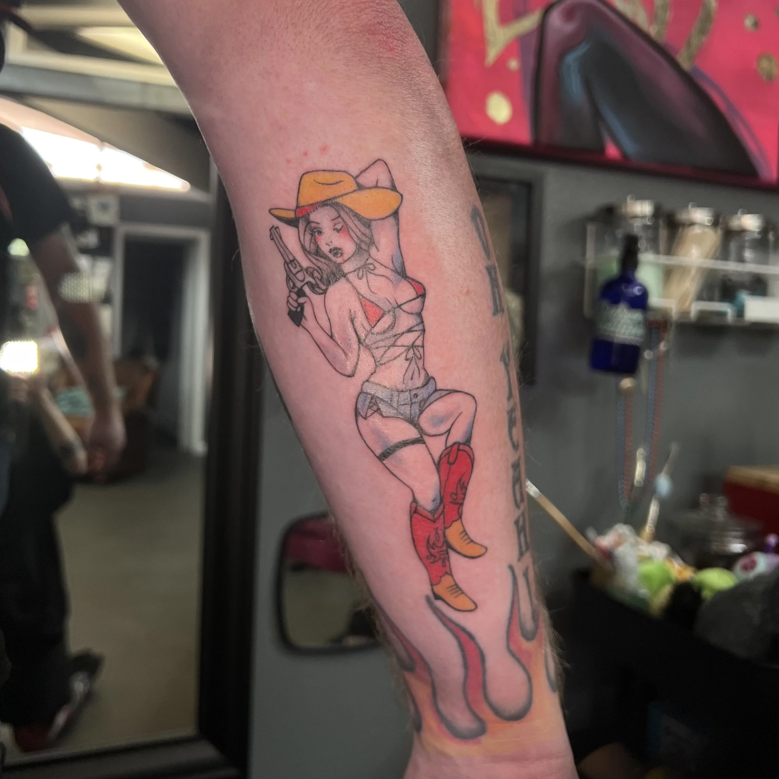 Lrlneedles, (Lorelai), hails all the way from Texas. She is our newest apprentice bringing the heat! This 2nd year apprentice is interested in her own illustrative style, woodcut style, American Traditional, Realism, and others. Pop into the shop and take a look at her flash or book for a custom design! Instagram & Facebook: @lrlneedles